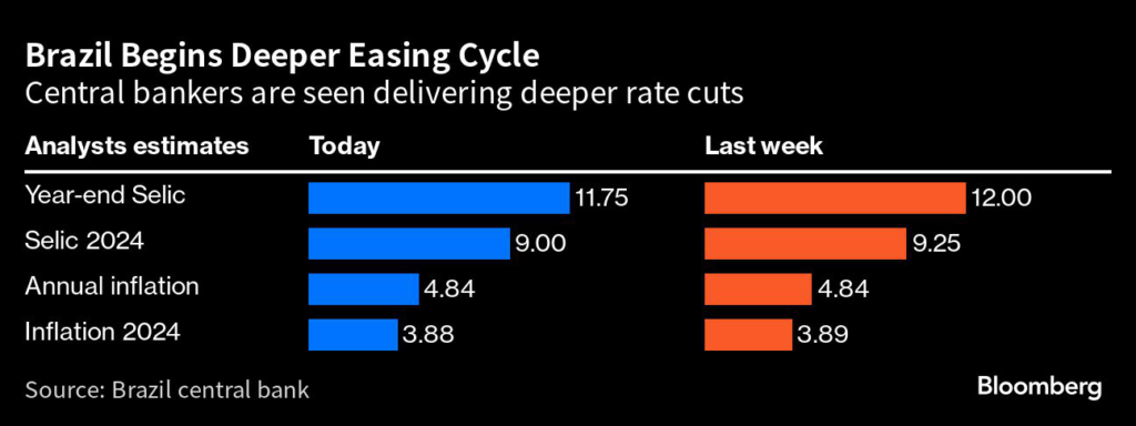 (Bloomberg) — Brazil analysts cut their interest rate forecasts for this year and next after central bankers launched a monetary easing cycle with a bold half-a-percentage point cut last week.