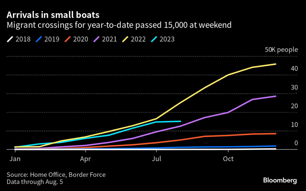 (Bloomberg) — Fewer than one in ten Britons think Rishi Sunak will meet his pledge to stop asylum seekers reaching the UK by small boat, according to a YouGov survey that underlines the prime minister’s failure so far to match rhetoric with results on immigration.