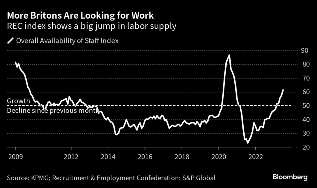 (Bloomberg) — Britain’s red-hot labor market showed signs of loosening with recruiters reporting a strong jump in the number of people looking for work and a drop in demand for staff.