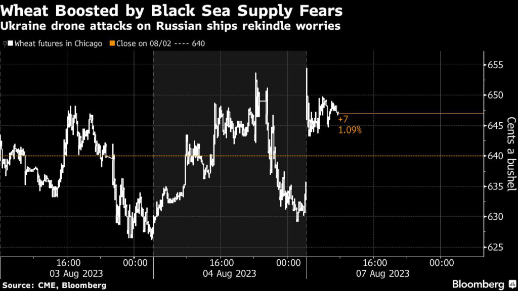 Wheat extended gains after Ukraine used naval drones to cripple a Russian vessel and an oil tanker over the weekend, jeopardizing a key export route for Russian commodities through the Black Sea.