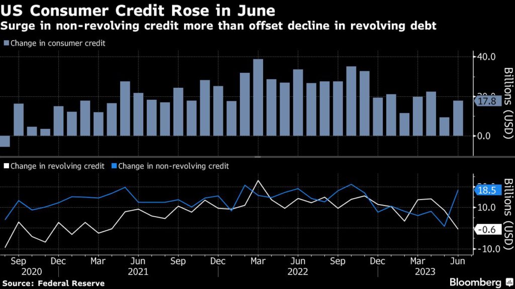 (Bloomberg) — US consumer borrowing increased in June by more than forecast on the biggest gain in non-revolving credit in eight months.