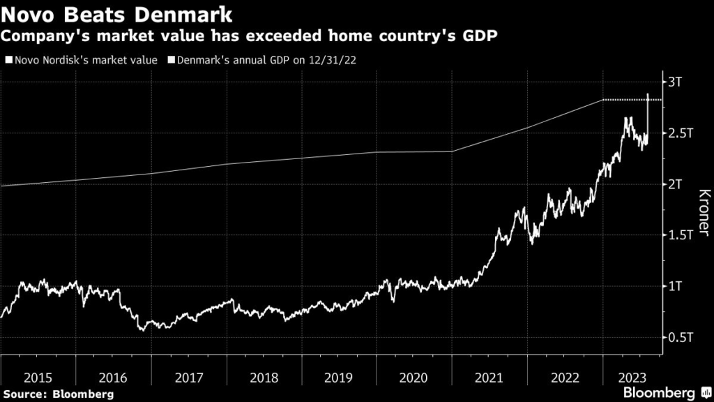 (Bloomberg) — Novo Nordisk A/S has just reached another milestone in its meteoric rise: the market value of the Danish company has exceeded the size of its domestic economy.