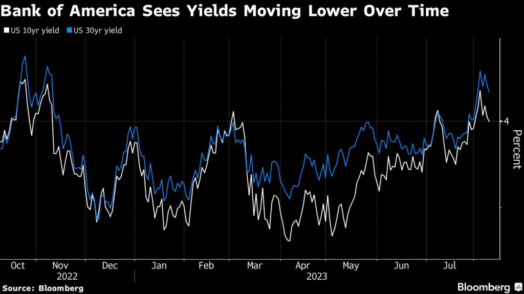 (Bloomberg) — Treasury yields are primed to edge lower over time as the Federal Reserve keeps interest rates higher for longer before eventually cutting at a slower pace than markets expect, according to Bank of America Corp.’s Mark Cabana.