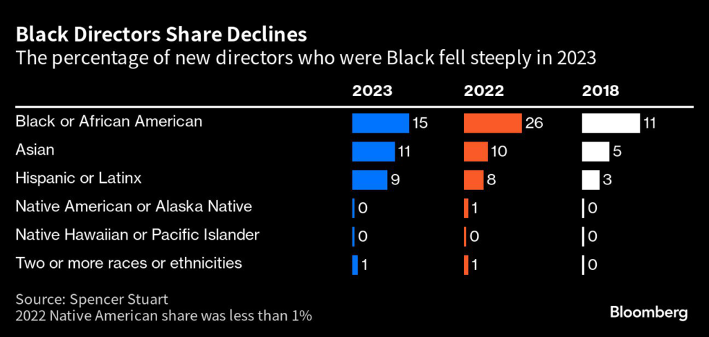 (Bloomberg) — The share of new Black directors at S&P 500 companies fell by nearly in half in 2023, returning to levels closer to those seen before the murder of George Floyd by police brought fresh attention to the lack of diversity on corporate boards.