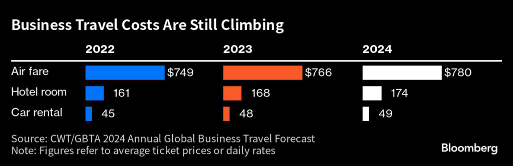 (Bloomberg) — The soaring cost of business travel is projected to climb even higher this year and in 2024 as relentless post-pandemic competition for airline seats, hotel rooms and hire cars drives up prices.
