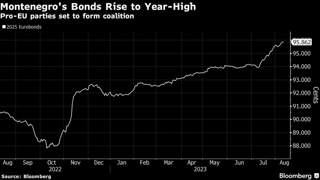 Montenegro’s international bonds have been gaining for much of 2023. The notes maturing in 2025 are trading close to 96 cents on the euro, the highest levels for more than a year, according to data compiled by Bloomberg.