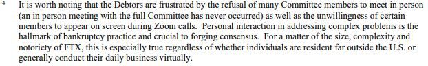 In footnotes, FTX’s filing indicated Ray’s team is frustrated that many members of the official committee of unsecured creditors refused to meet in person and that some remained cloaked on Zoom calls.