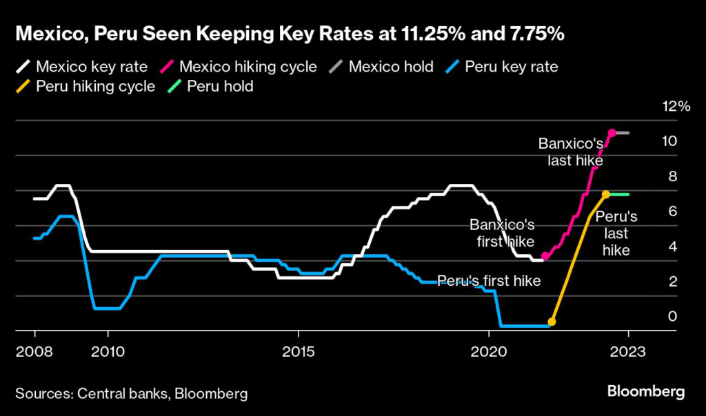(Bloomberg) — Mexico and Peru are forecast to maintain borrowing costs at their current levels Thursday, as both central banks focus on ensuring disinflation is fully consolidated.