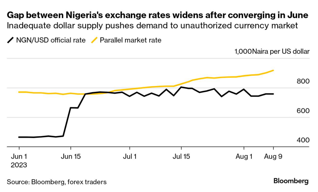That led to a 40% plunge in the official rate and persistent volatility, with the naira trading between about 750 and 800 a dollar over the last month. What’s more, the spread between the official and black market rates has widened again, reaching 18%, the highest since mid-June when the currency was allowed to trade more freely.