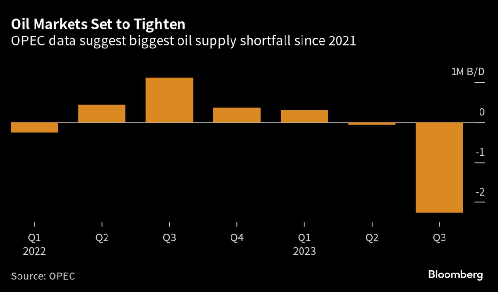 (Bloomberg) — Global oil markets are on track for a sharp supply deficit of more than 2 million barrels a day this quarter as Saudi Arabia slashes production, OPEC data indicate.