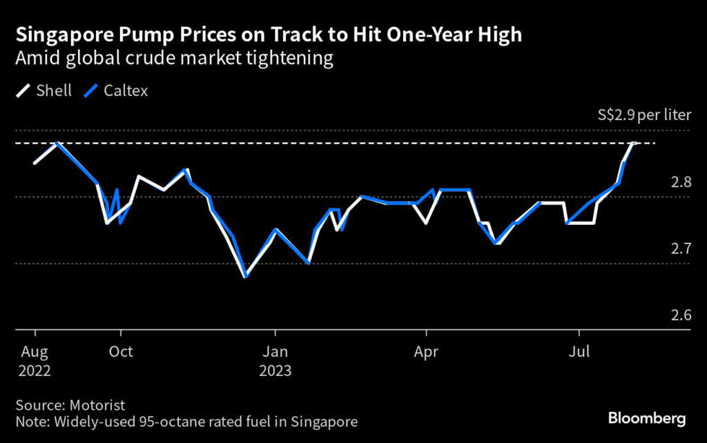 Pump prices in Singapore have surged to an 11-month high, adding to concerns about persistent inflation in the Asian financial hub.
