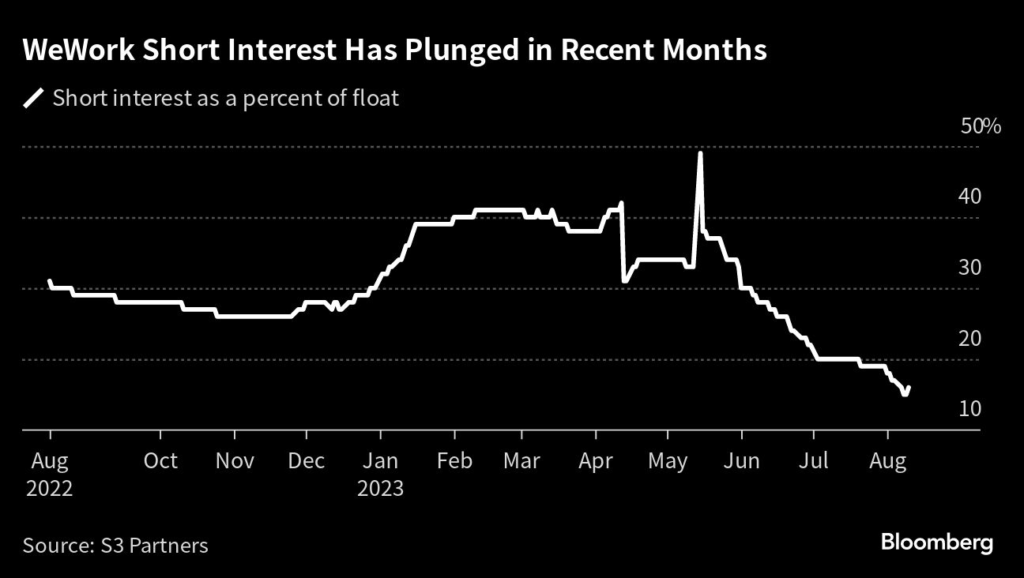 Even with the company’s travails, including a beaten-down real estate market and losing its chief executive, bearish interest in WeWork have been subsiding in recent months, with short interest falling to 14% of its free float, the lowest level since February 2022, according to data compiled by S3 Partners.