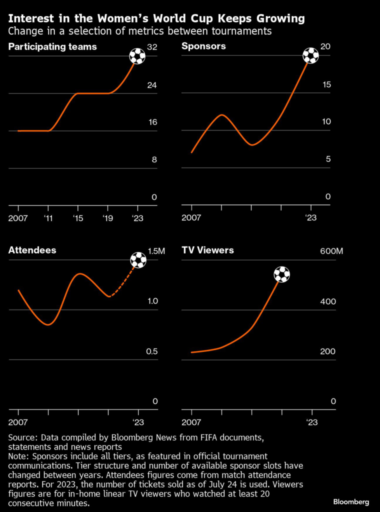 (Bloomberg) — The FIFA Women’s World Cup faces a huge shortfall in sponsorship compared to the men’s tournament just eight months ago, new analysis reveals, as brands continue to miss a key opportunity to reach an engaged audience.
