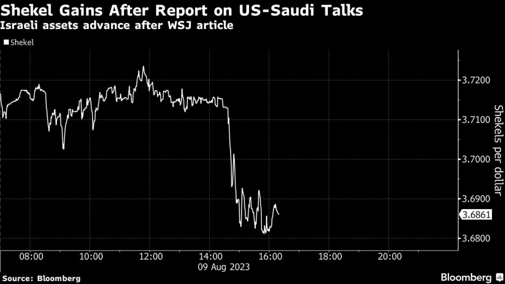 Israeli assets rose after the Wall Street Journal, citing American officials it didn’t identify, reported that Washington and Riyadh had agreed on the broad outlines of a deal.