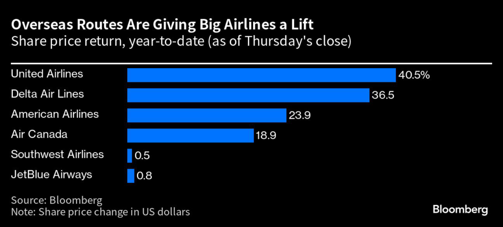 “We are particularly pleased with our international performance, propelling nearly 70% of the year-over-year increase in passenger revenues,” Chief Executive Officer Michael Rousseau said Friday in a statement.