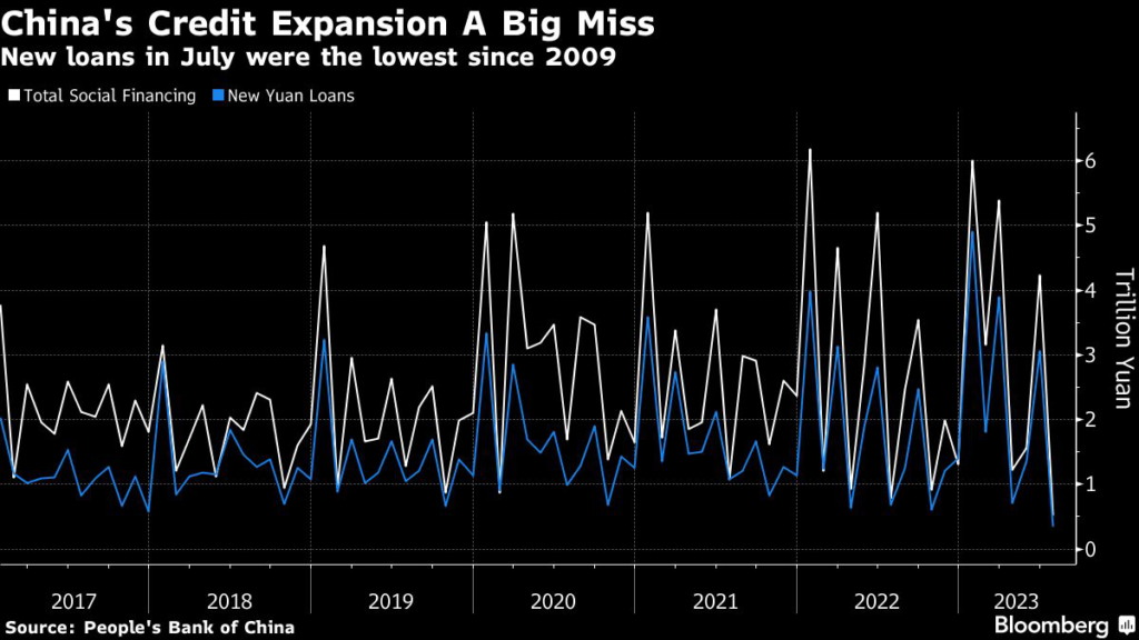(Bloomberg) — Chinese banks extended the smallest amount of monthly loans since 2009 in July, a further sign of weak demand in the world’s second-largest economy that raises the risk of prolonged deflation pressure.