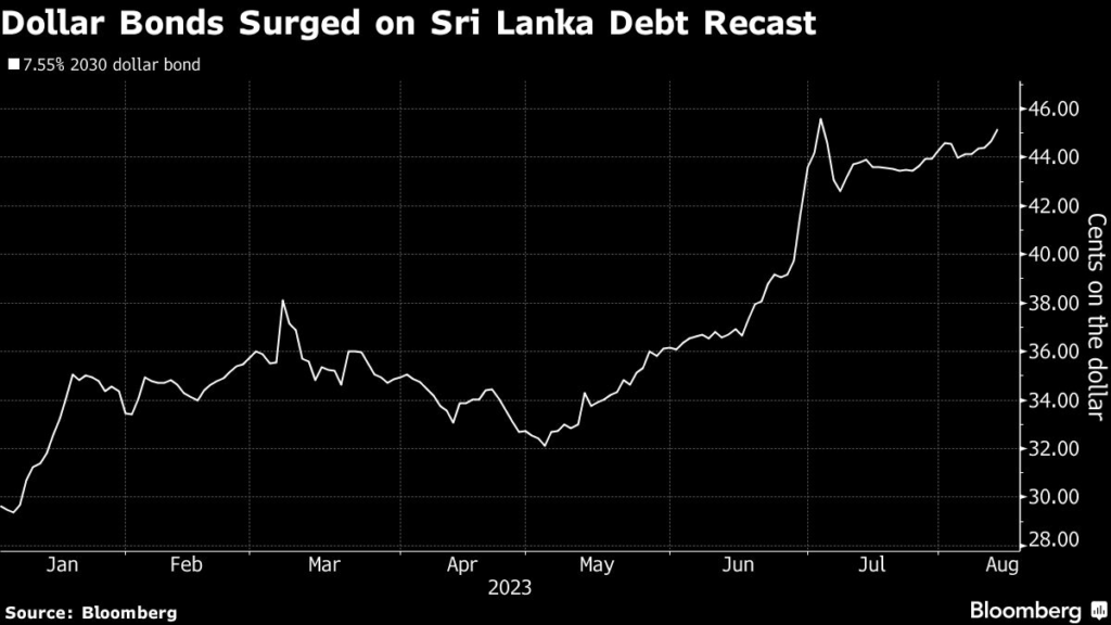The bonds have surged 15% since Sri Lanka unveiled its domestic debt restructuring plan around the end of June.