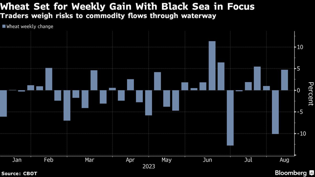 Wheat, meanwhile, headed for a weekly gain as traders weighed the risk to Black Sea flows after an escalation of hostilities between Ukraine and Russia.