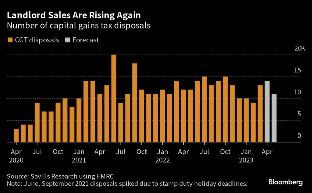 The amount of homes sold by landlords rose to 25,000 between April and May from 22,000 in February and March, according to forecasts based on an analysis of capital gains tax receipts compiled by Savills Plc.