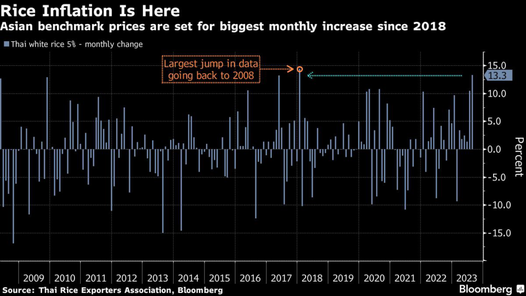 Benchmark Thai white rice jumped to $648 a ton last week and is on course for the biggest monthly advance since January 2018, threatening the availability of a food staple for billions in Asia and Africa.