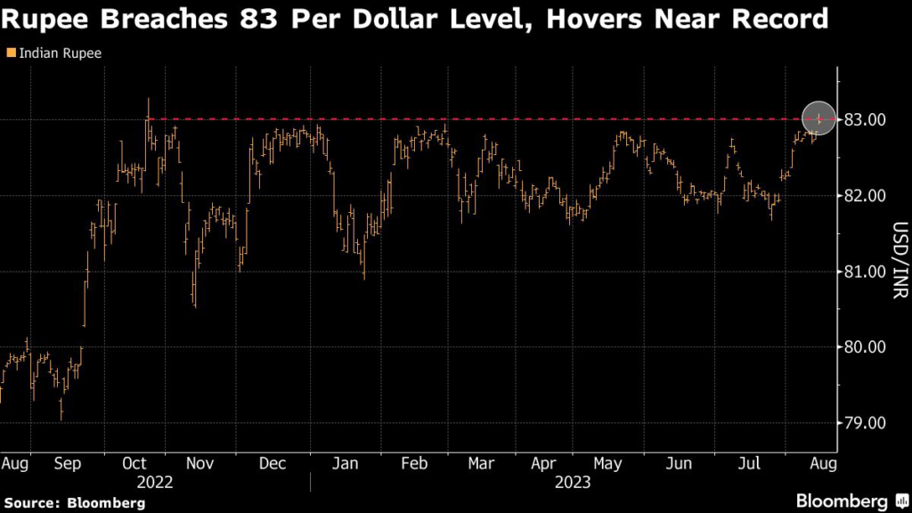 The currency weakened as much as 0.3% to 83.0762, past the 83-per-dollar threshold for the first time since October, before paring the drop to 0.1%.