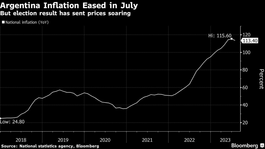(Bloomberg) — Annual inflation in Argentina eased slightly in July before last Sunday’s stunning election result sent prices soaring.