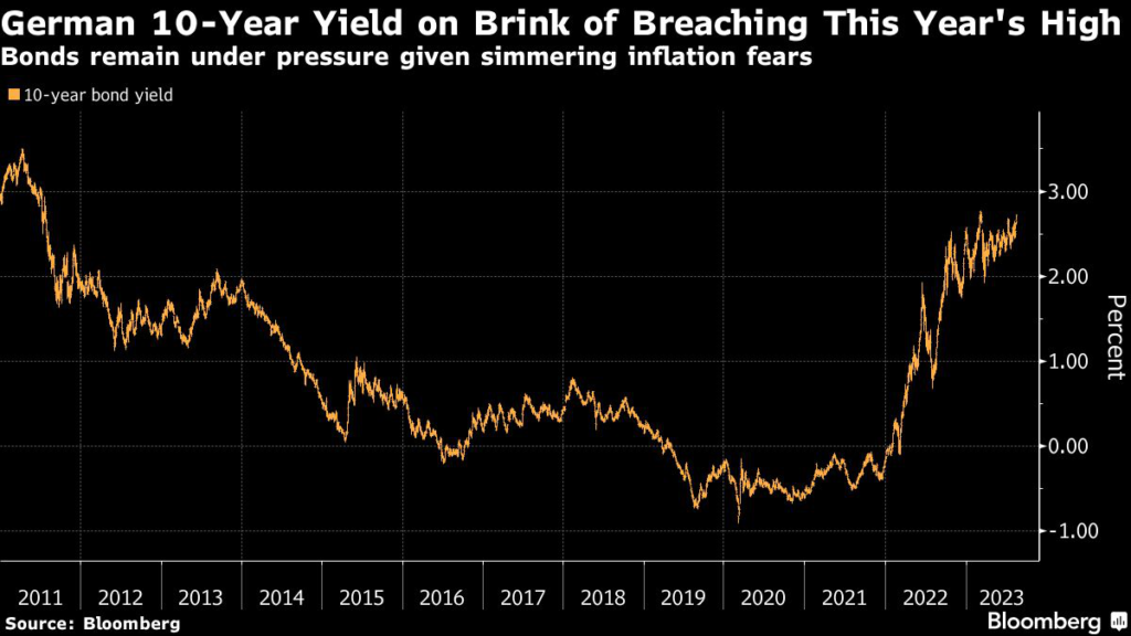(Bloomberg) — European bonds slid on Tuesday as record UK wage-growth data buttressed the case for more interest-rate hikes, making the prospect of a long-hoped for pivot all the more elusive.