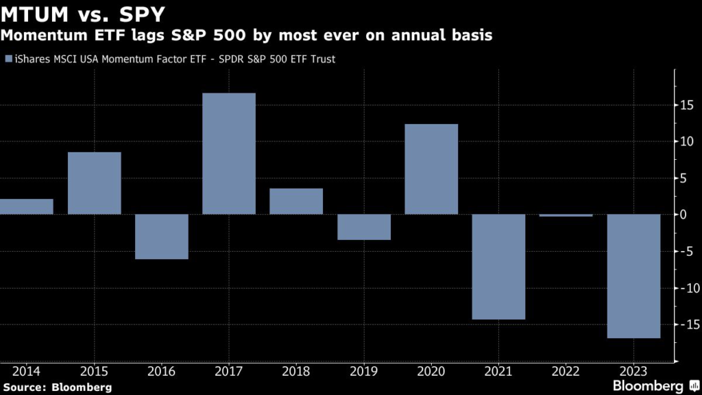 The $9 billion iShares MSCI USA Momentum Factor ETF (ticker MTUM) is trailing the S&P 500 by the most ever on an annual basis, according to data compiled by Bloomberg.