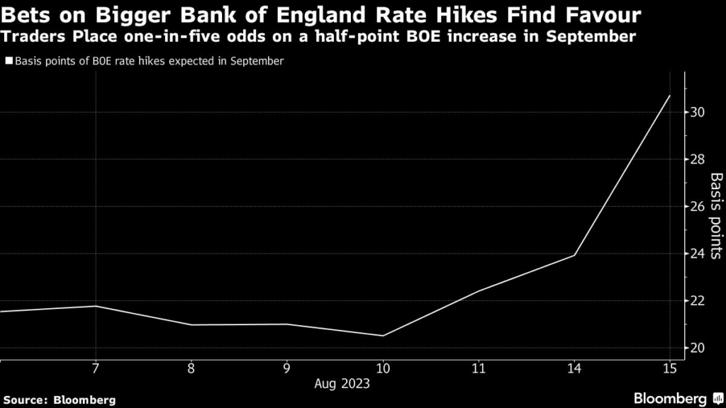 (Bloomberg) — Traders are once again entertaining the prospect of an outsized interest-rate hike in the UK, setting the nation’s battered bond market up for further losses.