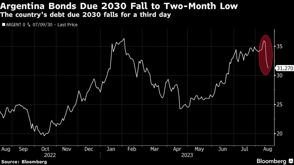 Argentina’s assets sold off after Milei, an outsider few investors saw as a serious contender until now, came out ahead in the primary, seen as a barometer for presidential elections in a country where polls are notoriously unreliable.