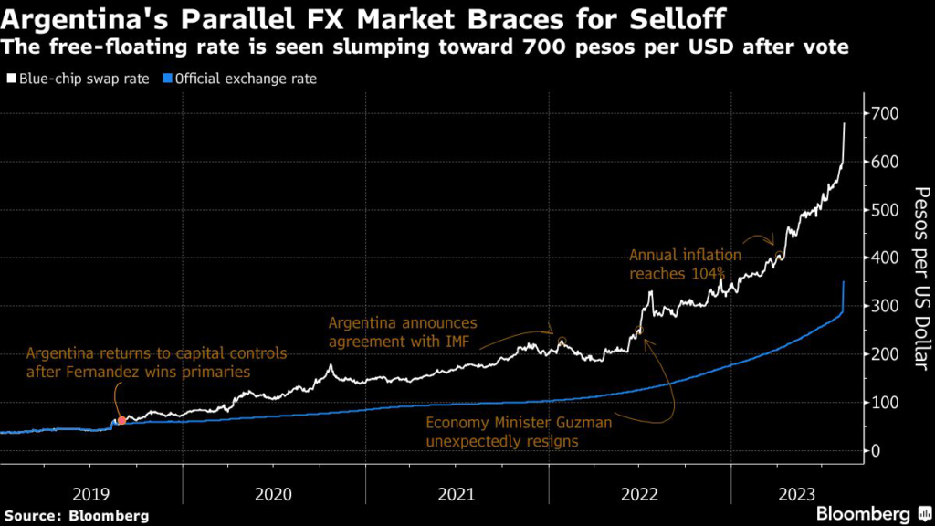 Argentine assets slumped following a stronger-than-expected performance by libertarian candidate Javier Milei, who wants to dollarize the economy and abolish the central bank.