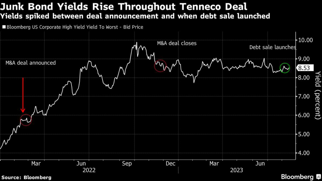 That shifted risk to the banks, which agree to cap companies’ borrowing costs based on market levels at the time such a financing is struck. When the Tenneco deal was announced, junk bonds were yielding around 5.7%.