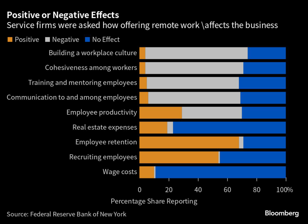 (Bloomberg) — Business leaders think that the spread of remote work has had more negative effects than positive ones, but they also see the practice becoming ingrained, according to a new survey by the Federal Reserve Bank of New York.