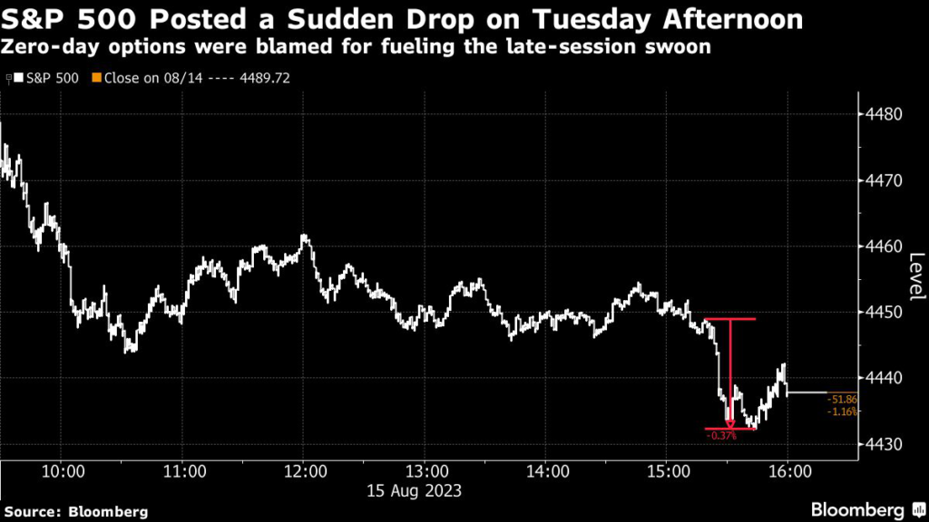 A flurry of trading in the contracts known as zero days to expiration, or 0DTE, was the backdrop to a jarring acceleration of the day’s decline, one in which the equity benchmark slid roughly 0.4% in 20 minutes, according to Goldman Sachs Group Inc.’s managing director Scott Rubner.