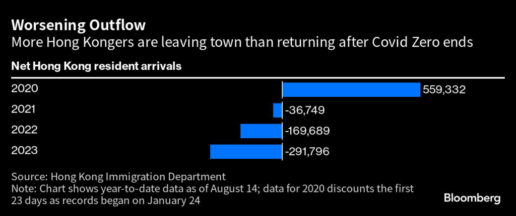 (Bloomberg) — Hong Kong saw its biggest net outflow of residents since the beginning of the Covid pandemic, the latest sign that the city is far from regaining its mantle as a business hub and tourist destination.