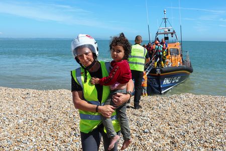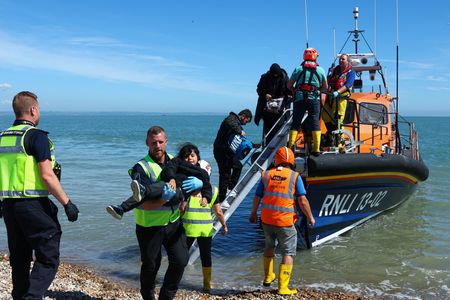 DUNGENESS, England (Reuters) – Dozens of men, women and children arrived on a shingle beach on the southern coast of England on Wednesday, tired but relieved to be brought ashore by a large orange lifeboat after making the risky sea crossing from France in rubber dinghies.