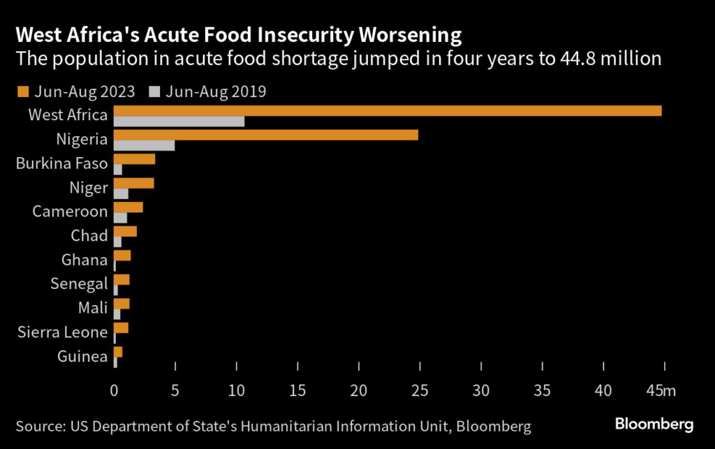 (Bloomberg) — The number of West Africans suffering acute hunger has surged fourfold since 2019, driven in part by Nigeria’s fight against jihadists and military coups in Burkina Faso and now Niger.