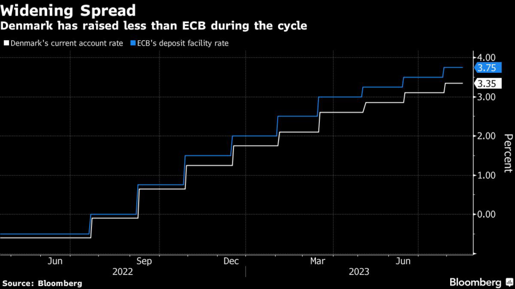 The Danish central bank, whose mandate is to peg the krone to the euro, has already raised borrowing costs less than the ECB in the past year to weaken its currency amid booming exports.