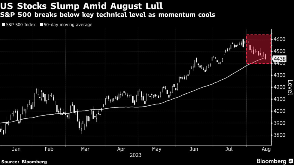 The S&P 500 closed below its average price over the last 50 days for a second day after a wave of trading in zero-day options helped push the index below the trendline for the first time since March at the tail-end of the prior session.