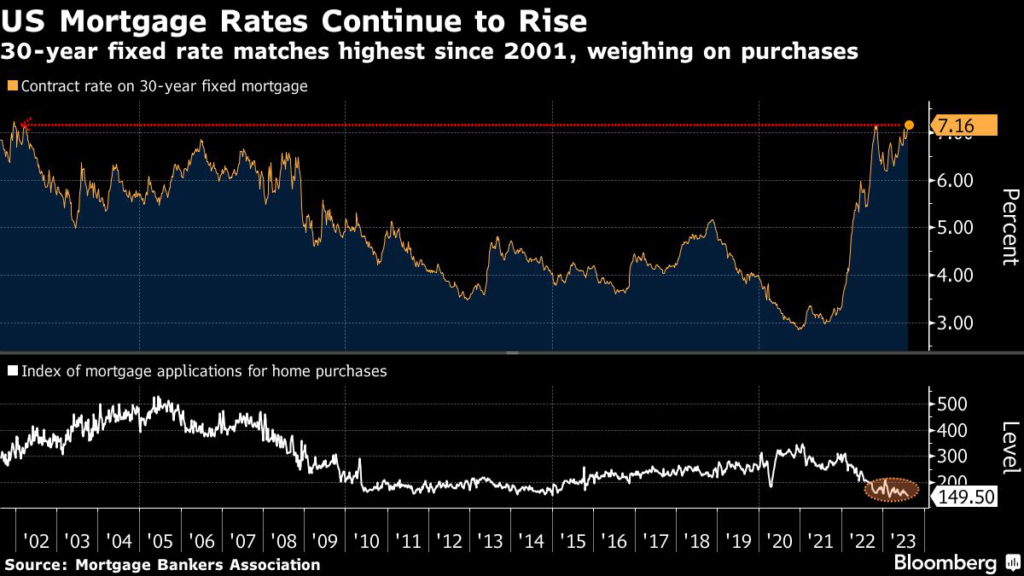 The US 30-year mortgage rate rose to 7.16% last week, matching the highest since 2001 and crimping both sales and refinancing activity.