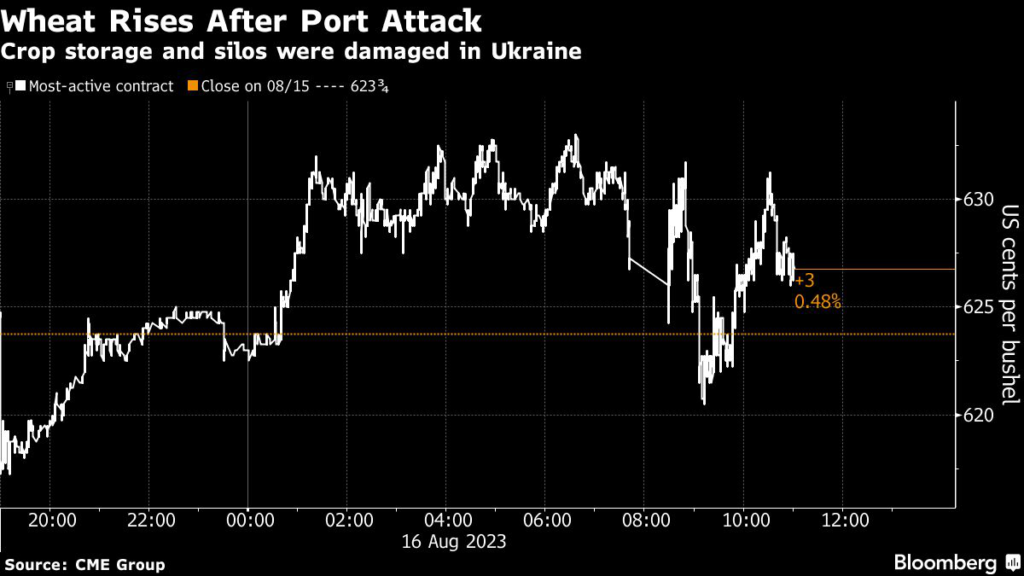 (Bloomberg) — Wheat prices in Chicago rose on Wednesday after Russian drones reportedly hit a key Danube River grain port, in the latest attack aimed at Ukraine’s crop-export infrastructure.