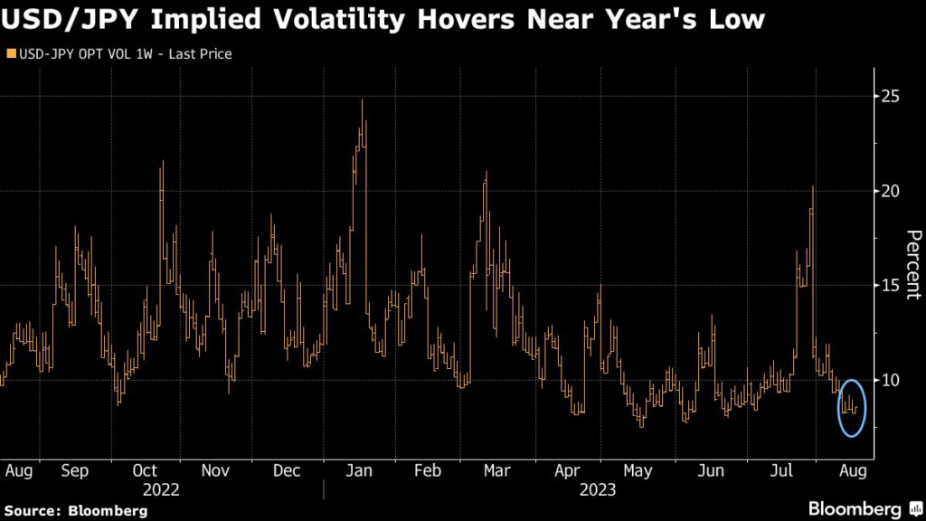 One-week implied volatility in dollar-yen, a gauge of expected movement in the currency pair over the period, ticked higher on the day but remains near this year’s lows.