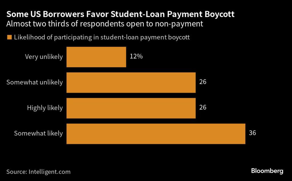 About 62% of respondents say they are somewhat or highly likely to participate in boycotting student-loan payments. That would amount to tens of millions of borrowers.