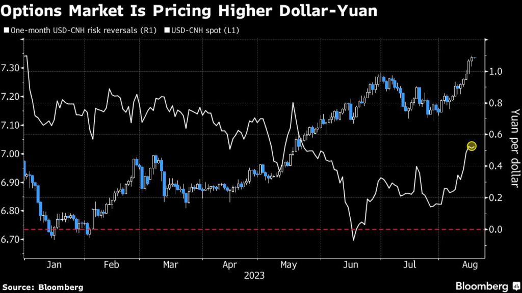 One-month offshore dollar-yuan risk reversals, a gauge of demand for bullish call options over bearish puts for the pair, jumped to the highest since May this week.