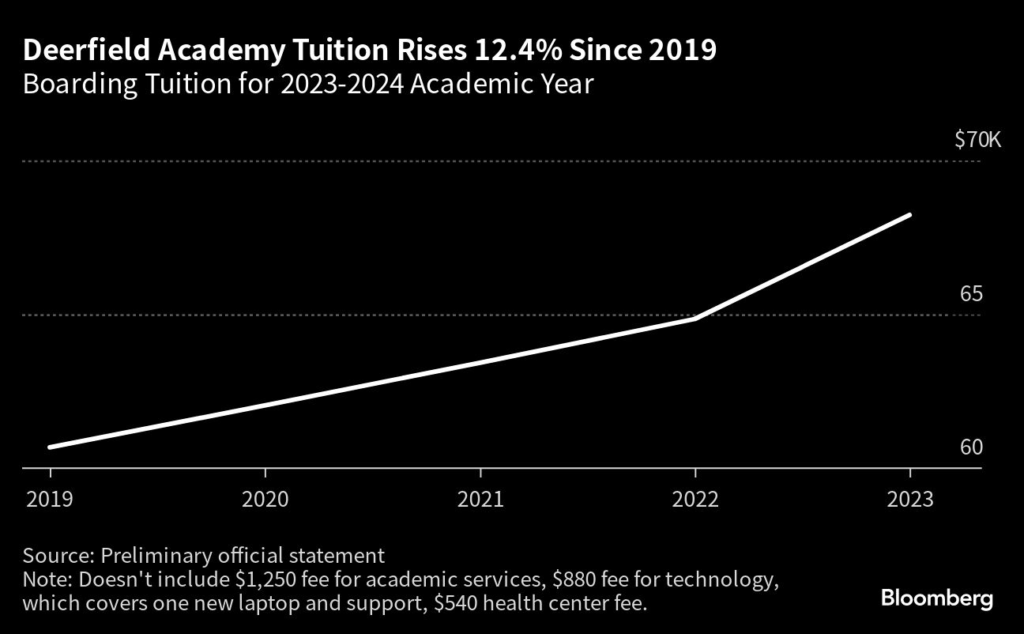 The $68,230 price tag to attend Deerfield puts it about in the middle of the competition, with New Hampshire’s Phillips Exeter Academy at $64,789 and The Lawrenceville School in New Jersey at $76,080.