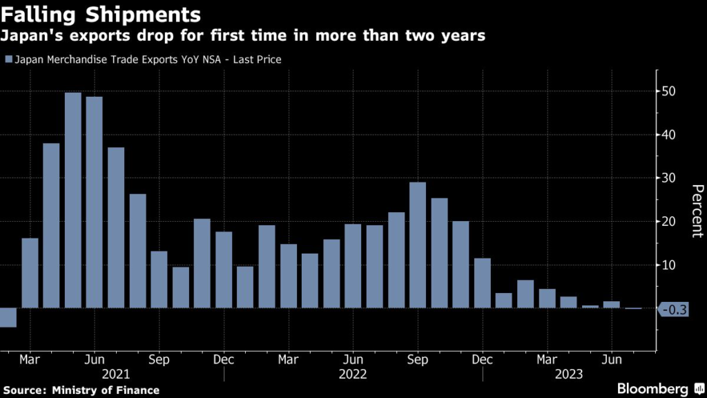 (Bloomberg) — Japan’s exports dropped for the first time in more than two years as patchy overseas demand weakened, signaling headwinds for an economic recovery that has relied increasingly on external markets as domestic spending sputters.