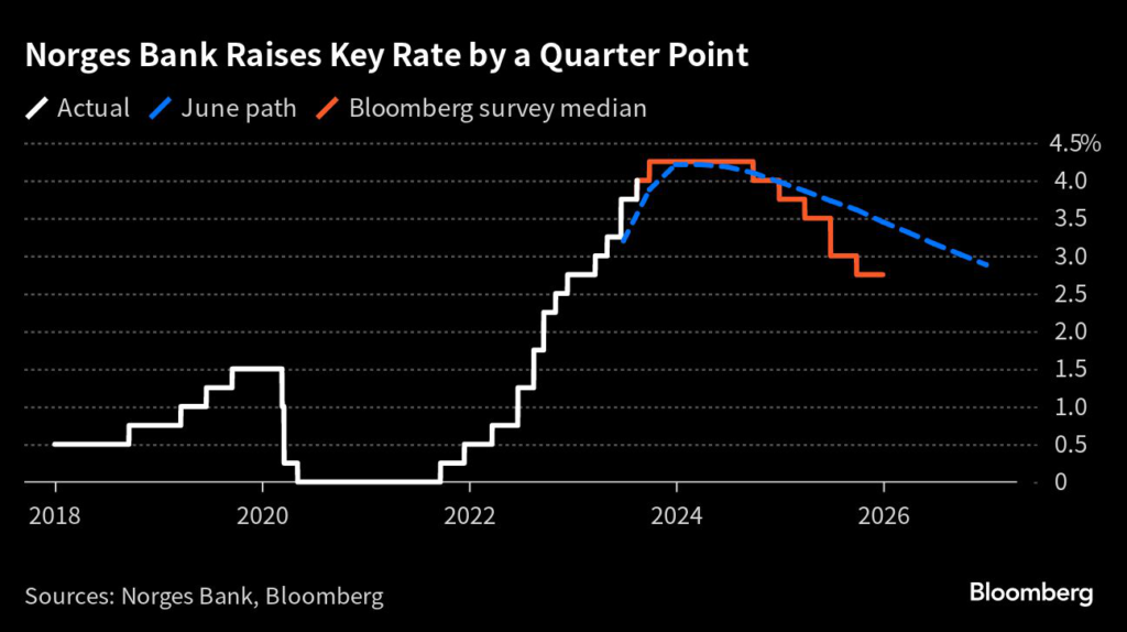 (Bloomberg) — Norway’s central bank raised borrowing costs to the highest level since the 2008 financial crisis and signaled it still plans another quarter-point hike in the current tightening cycle.