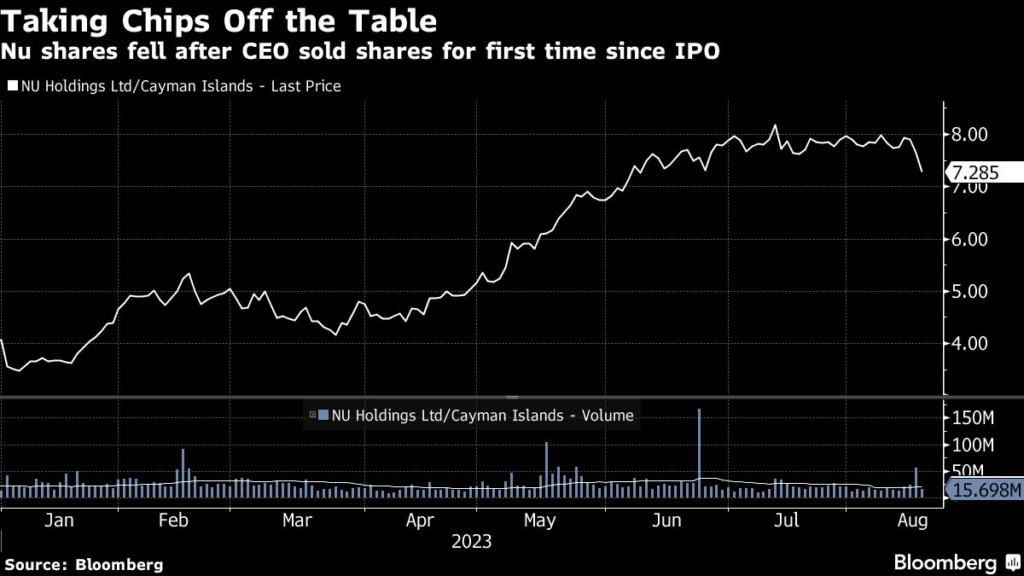 (Bloomberg) — Shares of Nu Holdings Ltd., the world’s biggest standalone digital bank, tumbled Thursday after co-founder and chief executive officer David Velez sold a part of his stake in the Brazil-based firm.