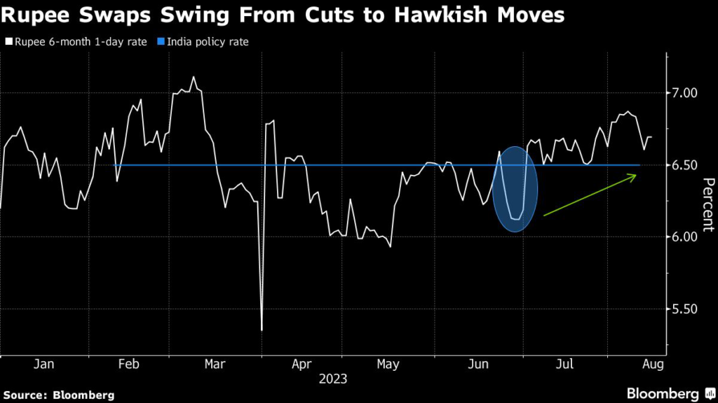 In India, six-month one-day swap rates are pricing a near 20 basis point rate increase over that time horizon after indicating a quarter percentage point cut over the same period at end-June.