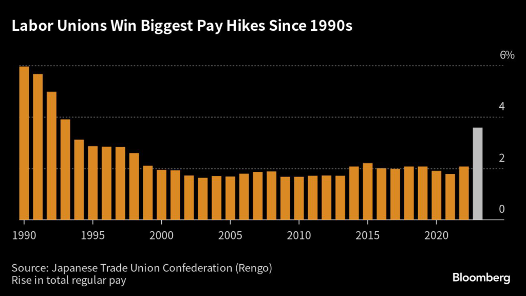 Japanese labor unions won a historic rise in total regular pay of 3.6% during annual spring negotiations this year, up sharply from 2.1% in 2022. Within this broad increase, there was much divergence, with some companies actually offering more than unions demanded, while laggards provided smaller wage hikes than last year.